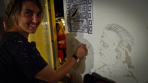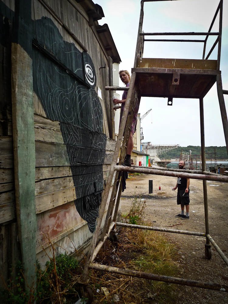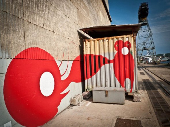 Posted: July 8, 2011 Filed under: News 2 CommentsClara and I worked on murals at this years ŠKVER festival, organized by Dunja Jankovic, one of my favorite artists. ŠKVER is a week long festival that largely centers around international artists paintings murals in a local Croatian shipyard—artists start coming into the shipyard after the workers have left around 3pm. It’s an incredible project—Mali Losinj, where the festival takes place, is largely a tourist destination—lots of fancy restaurants and beaches. ŠKVER, organized by local artists like Dunja, is an attempt to have something else on Mali Losinj—something for the people who live and work on the island. Here’s a small sampling of the work Clara and I did, plus some images by other artists. Hopefully I’ll have more pictures soon—there was a lot of work done over the week.