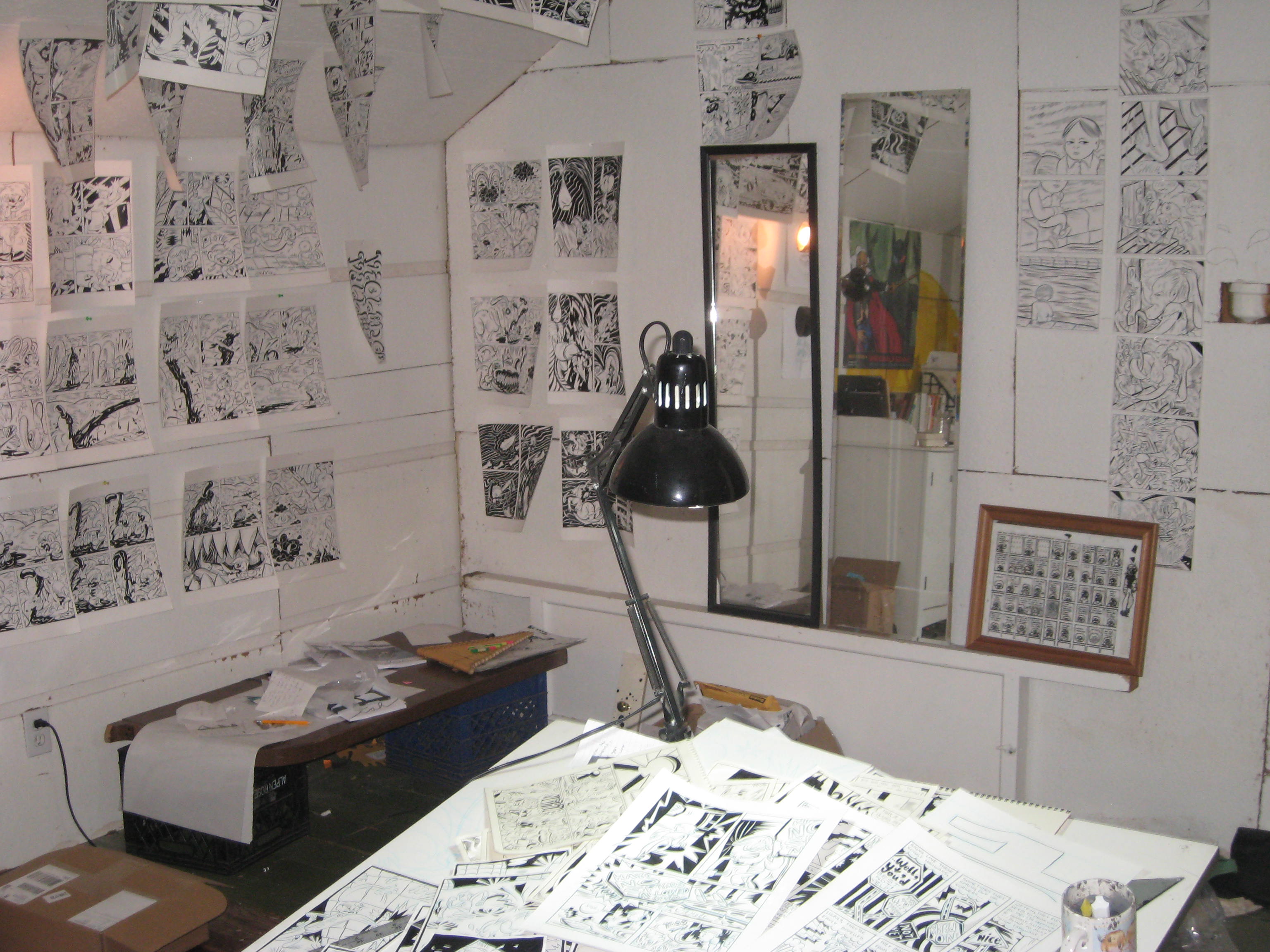 this was my drawing space from last year when i was working on violence valley and keyhole and had started work on spider monkey. the photo of the work in progress is a rejected page from violence valley. i live in a different place now but after the howlidaze this room is seriously outta control, beyond any hint of being photogenic. i hope you’ll forgive me including old photos from when i was young and lustrous.