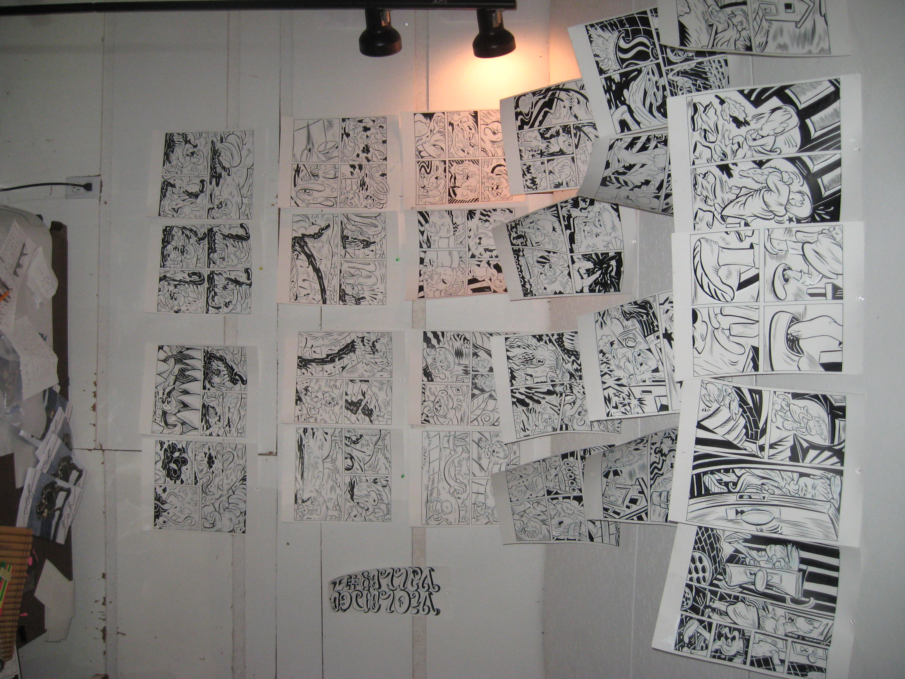 pinned up on a wall though, i get some perspective. i stare at these things and make an internal list of irritants. i love moving the pages through various phases and letting them co-habitate with their partners in crime until the story refuses to be worked on any more.