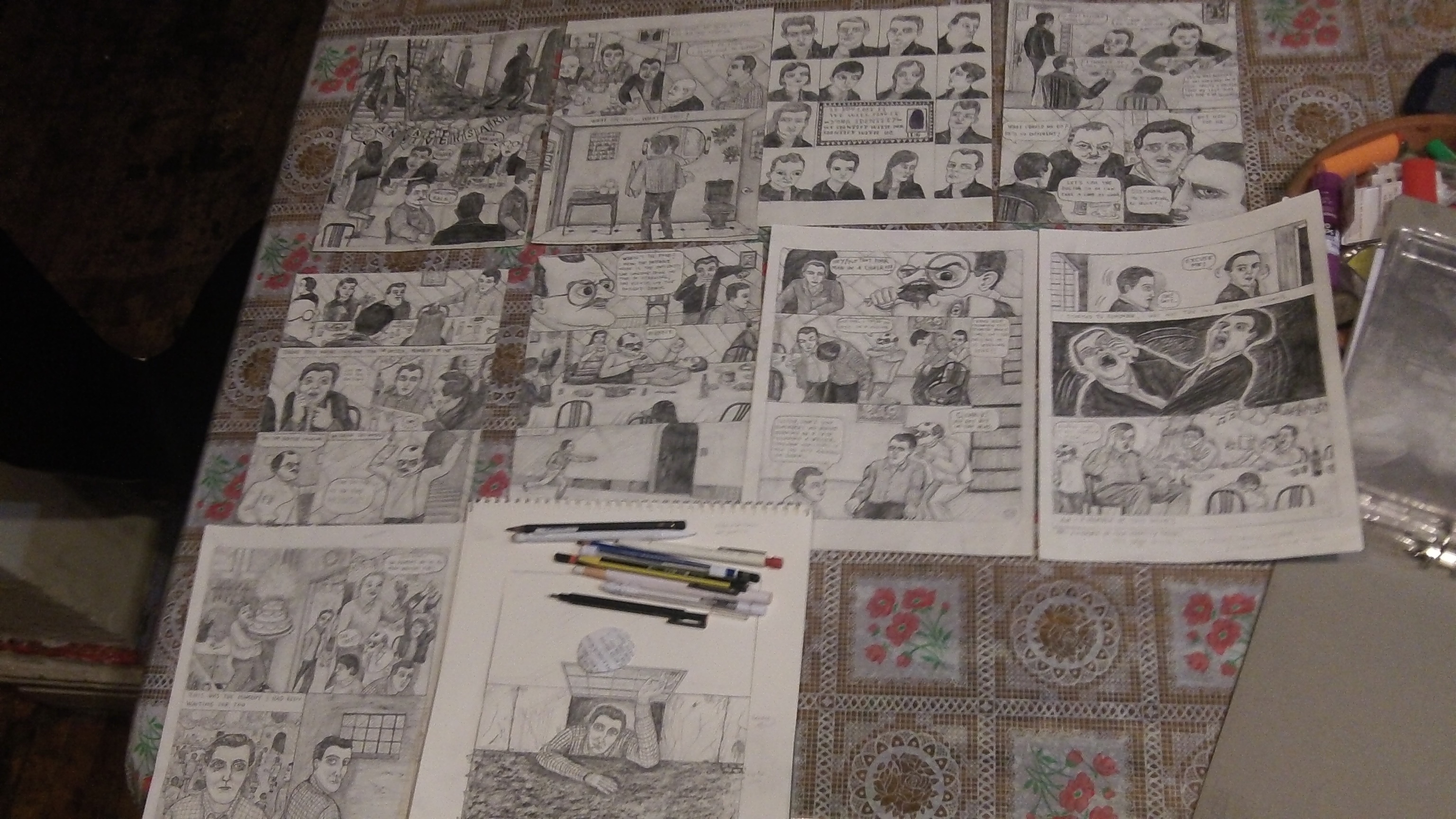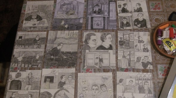 Posted: May 11, 2012 Filed under: News Leave a commentHere are two fairly incredible photos showing us all of the now completed pages from Clara Bessijelle’s forthcoming FACE MAN. That last drawing with the pencils on top of it is the in progress back cover.
