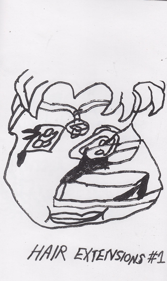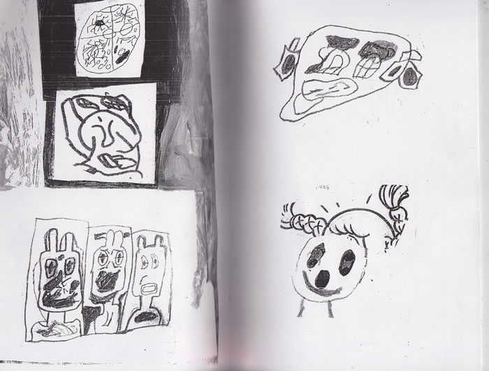 This is a collection of drawings by Brooklyn based artist Guillot, and I believe his first zine. Guillot shows a wide range of drawing interests here: light pencil shapes loosely sketched sitting on top of a slightly more rendered table are on one page, next to line-drawing character sketches with cartoony faces made with a fine pen. We turn the page and find a more fleshed out face study, with smears and washes. Then, further on, simple torso drawings that have not so simple faces. We go further and find llarge blobs of black ink that serve as the facial details for fleshy figure studies. Guillot even includes drawings made on old MS Paint style programs.