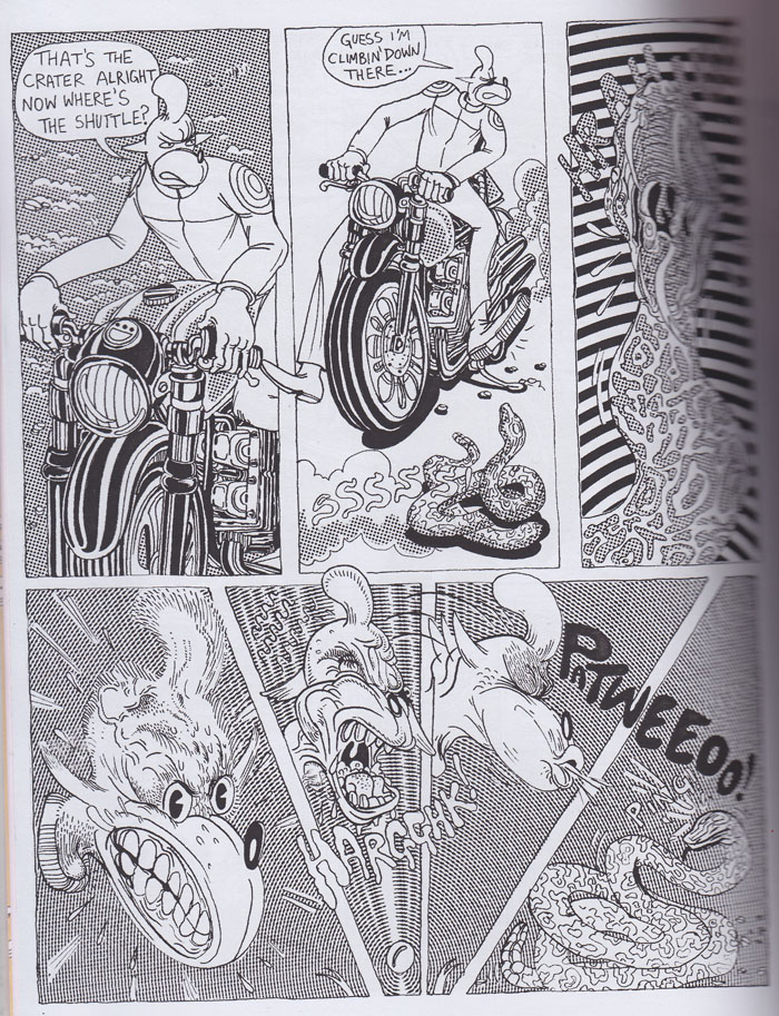 My favorite sequence here involves a hired motocyclist named Dinky spitting at a snake. Westvind spends so much energy drawing Dinky turning to spit that you almost want to cheer. The amazing part is, Hot Dog Beach is full of moments like this and for all their pleasure, the story itself chugs right along.
