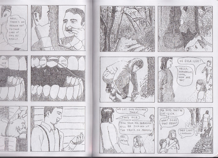 The writing is what really moved me here. A rural couple go through various actions of the day, but this is not fanciful slice of life. Everything we see Zebediah do colors him for us more as a character—he resists selling his hand made basket to craft collectors at the Smithsonian, he gets rid of tooth ache. Skillfully, Craw keeps us at a distance from Zeb—we like him but not too much. We like him at a respectful, not fully illuminated angle, but we are brought to this angle by Craw in a very deliberate way.