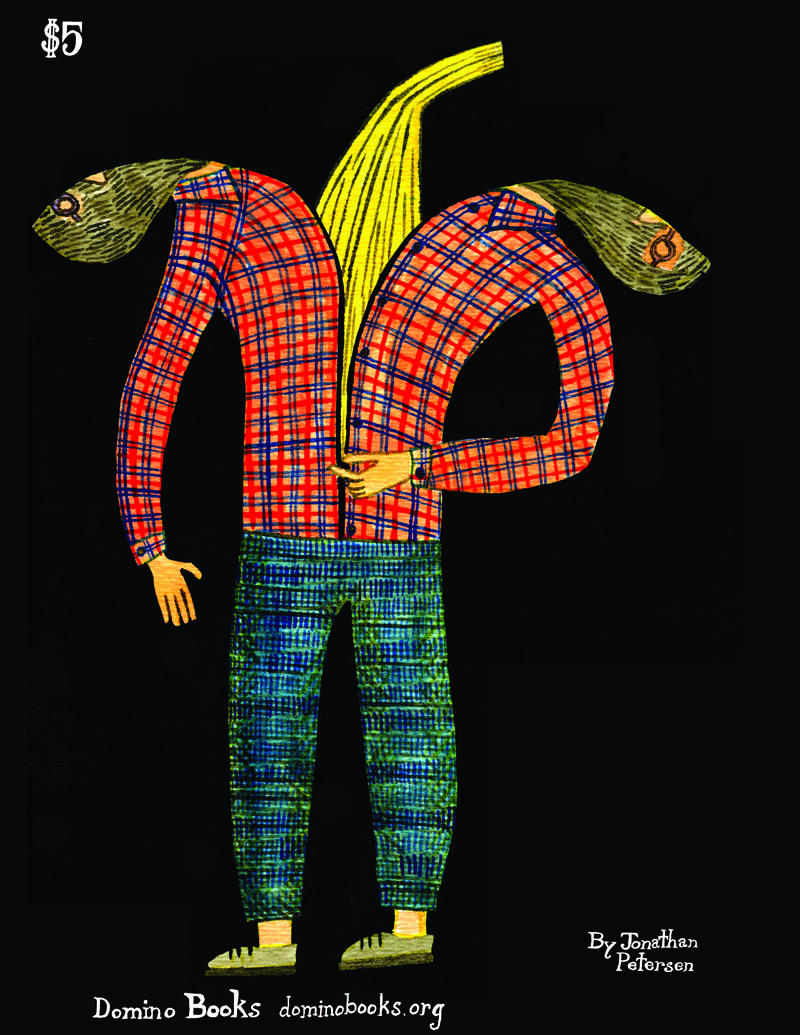 Posted: July 10, 2012 Filed under: News Leave a commentSpace Basket is the new book by Jonathan Petersen, one of our favorite artists at DOMINO. Petersen is an incredibly creative and prolific artist—he seems to make a new comic every month, in addition to statues and other art objects. His stories are clear and simple but bring out a lot of conflicting emotions—they are funny, oddly frightening and always pivoting to new action. While his work is a touchstone for artists like Marc Bell and Keith Jones, he remains mostly unknown in the USA. We hope that with the publication of this book, more readers will come to enjoy Petersen’s work. We send the book to the printers this week and it will be available for order in the DOMINO SHOP next week. For now, here’s a look at the front and back cover of the book.