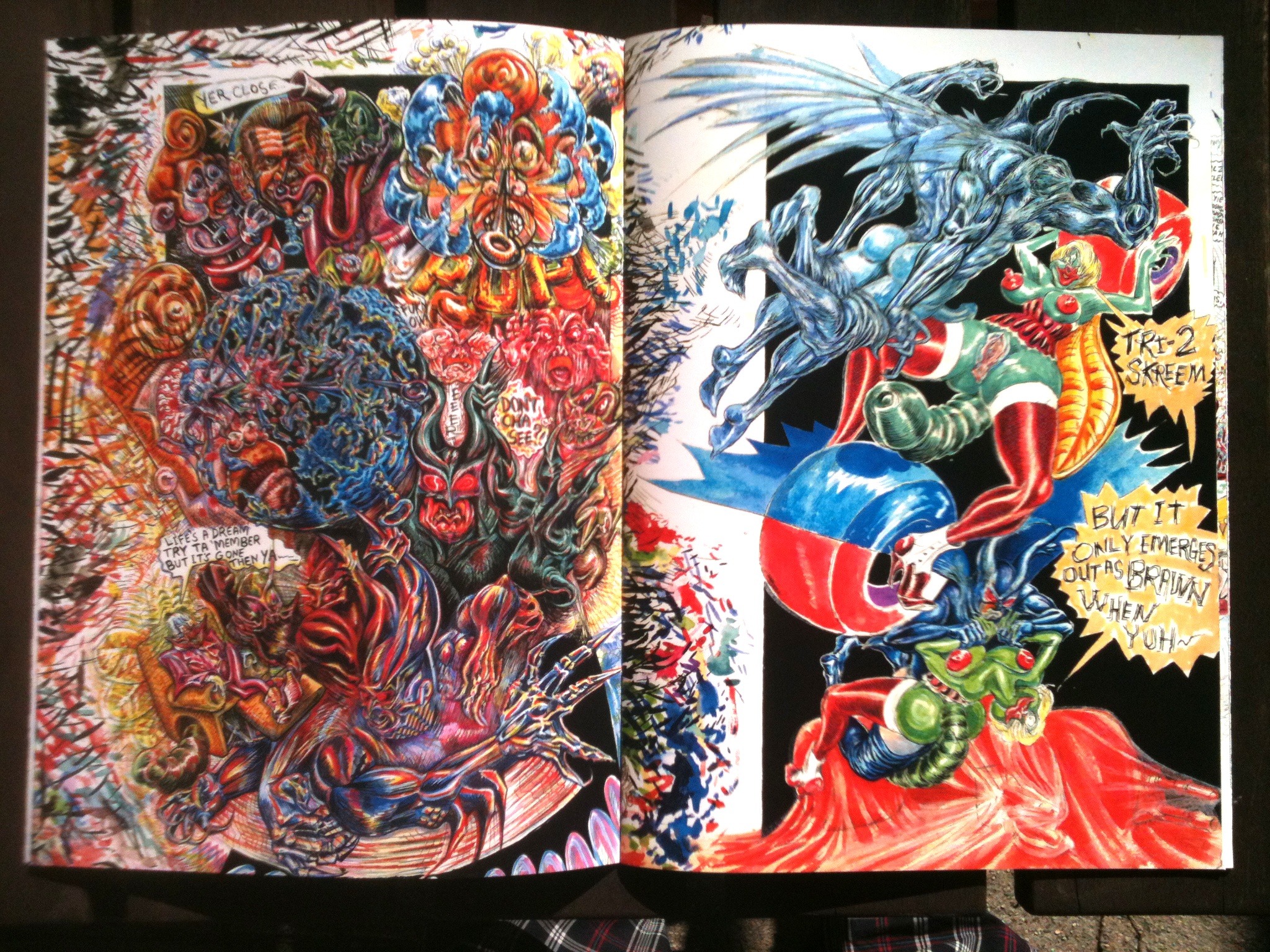 While the first thing that hits you with these pages is obviously the visual crush, what I’m most excited about is a tome of newly WRITTEN pages by Cayro. His drawings are so intense that I think the equally complicated/rich writing that every Victor Cayro comic displays gets lost in the shuffle. This promises to be a hulking work of art, and I’m so thrilled that it’s almost here. It’s hard to believe that a solo Cayro comic doesn’t exist yet, but as far as I can tell, every story so far has been in an anthology. Due congratulations to Drippy Bone for all the loving attention they put into this project—look at those endpapers!