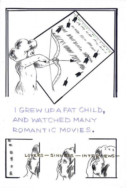 This was one of my favorite comics I’ve come across lately. It’s hard to tell if this is the author’s first comic—but it feels that way. That is to say, while the artist has certainly done a lot of work exploring their own world of images prior to making this book, the way this strong imagery is translated into a comic is, at the risk of sounding hyperbolic, thrilling. A least thrilling for an artist like me. There is a strong, strong sense of storytelling here, but removed from all the accepted ideas of what comics ‘needs’ to have to constitute good storytelling. Grids are not considered, nor are word balloons. That’s good—because Ferrick is more interested in more important things: a inventive sense of drawing that, while scraggly, is very downbeat. Unlike a lot of shaky line artists, Ferrick’s aesthetic is not one of manic assault but instead more matter-of-fact. Her characters are solid units of drawings and her rooms are expressive without being filled with throw away gestures. But it’s Ferrick’s compositions that strike me the most, particularly when she gives us a large drawing of Lumpy (one of the two characters here in this one-act play like narrative) sitting and talking to Spider. Lumpy is a ragged piece of drawing at the center of an almost bare room—I get the comfort of a children’s book from this image, but also the deeper satisfaction of looking at a fully articulated style of personal drawing—and, what’s more, Ferrick shows us Lumpy and Spider talking, deftly moving the story along without any strain or showiness. The story itself is quite moving—one friend visits another one, and one suggests that the others home is bare and uninviting. What Ferrick does that so few other art comic creators seem interested in is develop these characters through sparse dialogue and reactions and opinions subtle but rich with feeling and intelligence. These characters don’t ask you to like them or impress you. They act out something hard to define—my reactions to their story was all over the place, and that’s what true comics-as-poetry ought to be. I’m less interested in fractured sentences written within a panel than I am in difficult emotions and intentions being achieved so well.