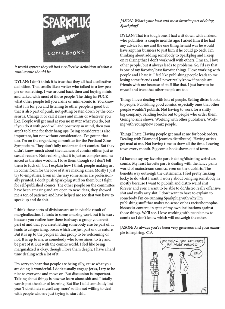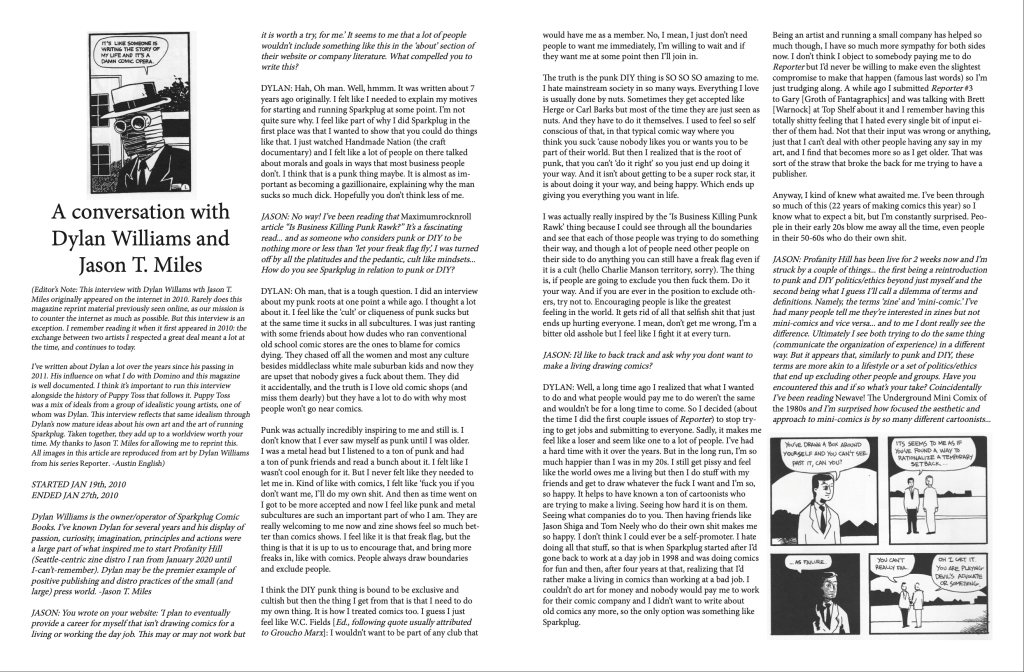 I met Dylan when I was around 16, at Al’s Comics in San Francisco. A couple months before we met, I had walked into Al’s and bought REPORTER #1, and loved it. There was a note written on the inside cover from Dylan to his readers, with a little drawing of an fashioned comics artist at a drawing table.