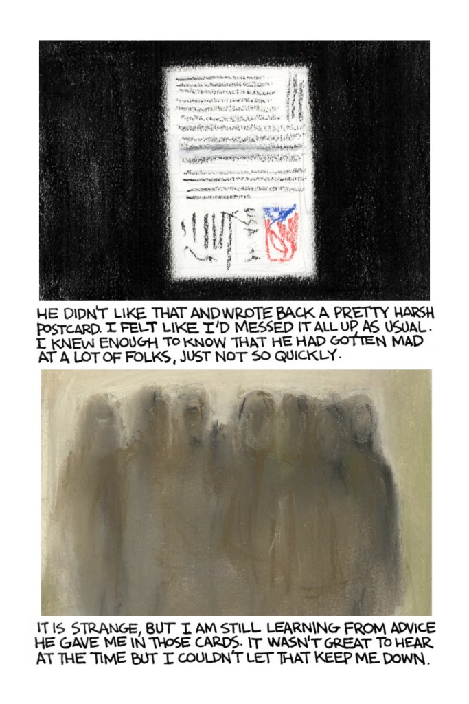 I had just started drawing comics when I met Dylan, and when we met in Al’s, Al handed Dylan a copy of one of my first mini comics (it was a comics biography of thelonious monk). Dylan , within a short amount of time, wrote me a warm letter about the comic–we’d talked for just a few minutes, but I think for Dylan, a teenager like myself making weird mini comics (if you aren’t keen on my crude drawing now, just imagine it at 16) was something that was, without question, to be encouraged.